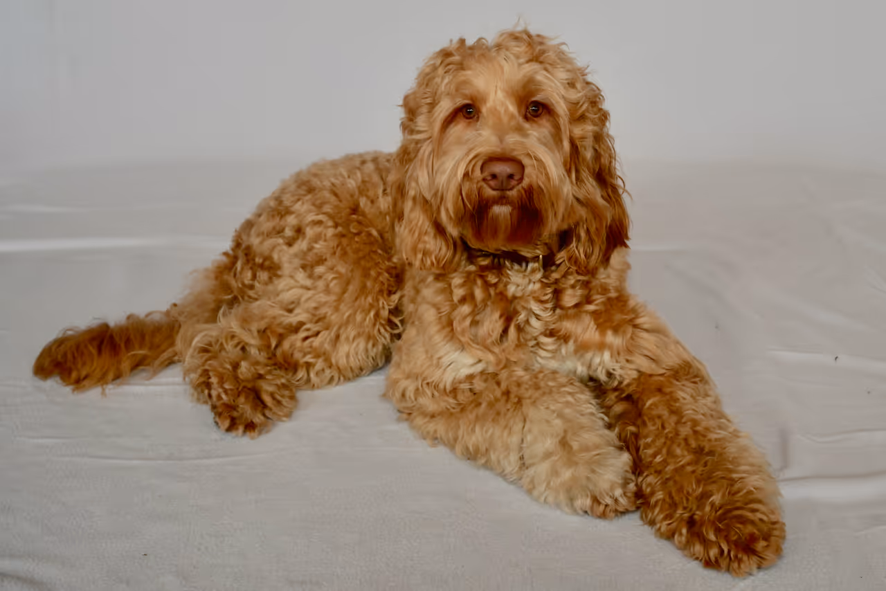 Yumas hat schönes, gewelltes Fell in Apricot. Er hat eine weisse Brust und eine weisse Pfote vorne rechts.