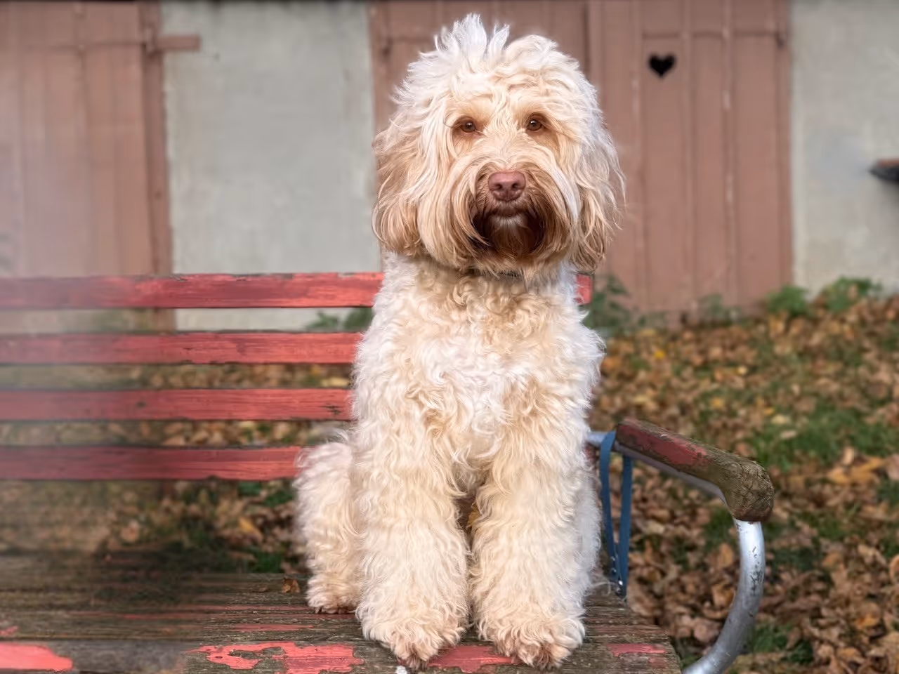 Mava hat ein samtigweiches, gewelltes Fell in hellem Caramel mit weisser Brust.